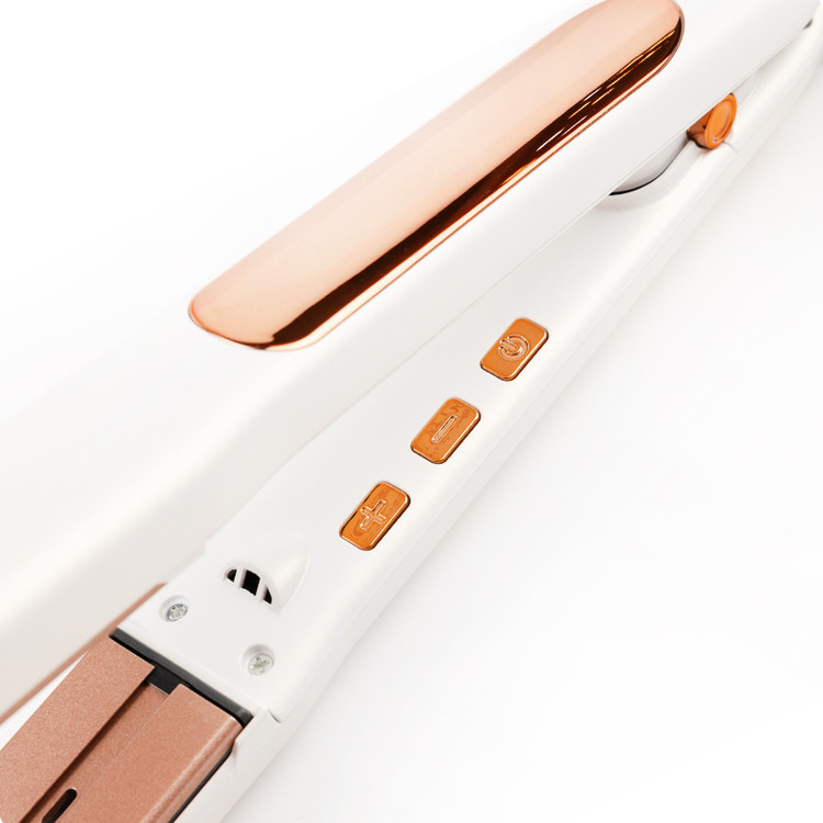 طراحی شیک با ترکیب رنگ سفید و مسی و نمایشگر LCD، تجربهای حرفهای و کاربرپسند ارائه میدهد. این دستگاه با گرمایش سریع در ۳۰ ثانیه آماده استفاده است و با صفحات سرامیکی شناور یک اینچی، تماس یکنواخت و صاف کردن موثر موها را تضمین میکند.
