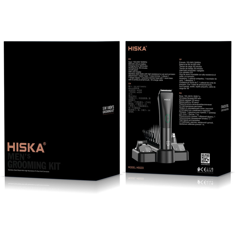 ماشین اصلاح 5 کاره هیسکا مدل H5533 مجهز به نمایشگر LED است که وضعیت شارژ و سرعت کار را نشان میدهد. باتری لیتیومی ۸۰۰ میلیآمپری آن تنها در ۶۰ دقیقه شارژ میشود و یک ساعت استفاده مداوم را ممکن میسازد. قابلیت استفاده با برق و باتری نیز انعطاف بالایی در شرایط مختلف فراهم میکند.