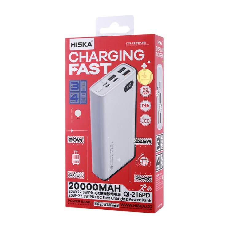 پاوربانک هیسکا مدل QI-216PD یا Hiska Power Bank Model QI-216PD با ظرفیت اسمی 20000 میلیآمپر ساعت امکان شارژ چندبارهی دستگاههای مختلف را فراهم میکند.
