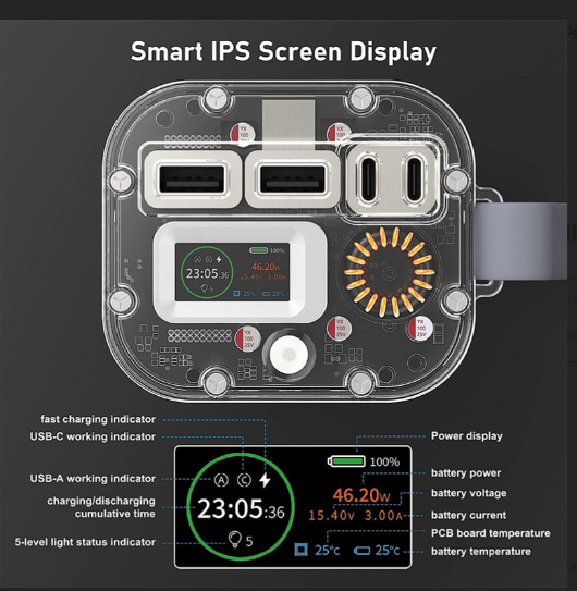 توان خروجی این پاوربانک 100 وات است که به معنی این است که میتواند دستگاههای با نیاز انرژی بالا را به سرعت و به صورت مؤثر شارژ کند.